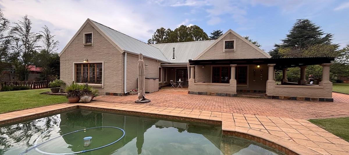 This unique farm style home with stoop half way round the house and inside doors open up to the stoop. This home offers you 3 bedrooms, 2 bathrooms, Living room with fireplace, open plan dining room and kitchen, a scullery, a laundry, 3 Garages, Entertainment area overlooking the pool.