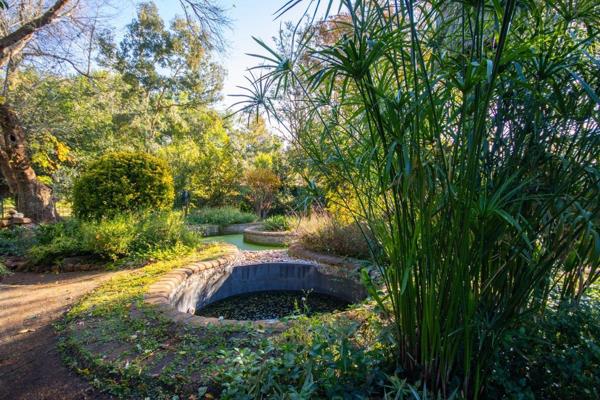 Lush, established gardens nourished by an excellent borehole system, featuring fruit trees, grape vines, vegetable beds, a natural pool pond, stone boma, and multiple secluded retreats under mature trees