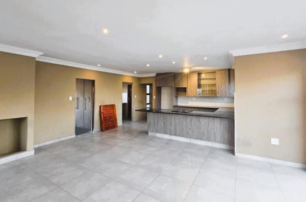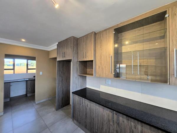 The interior boasts an inviting open-plan layout, seamlessly connecting the lounge, dining area, and kitchen. Large sliding glass doors and windows flood the space with natural light, creating an airy and welcoming atmosphere. The modern kitchen is a highlight, featuring stylish wood-look cabinetry, dark countertops, a built-in hob, and ample storage, making it both functional and aesthetically pleasing. Tiled flooring throughout ensures easy maintenance and a cohesive flow.
