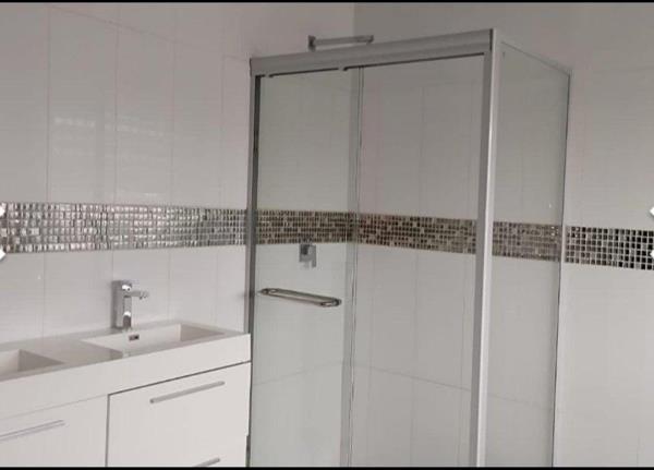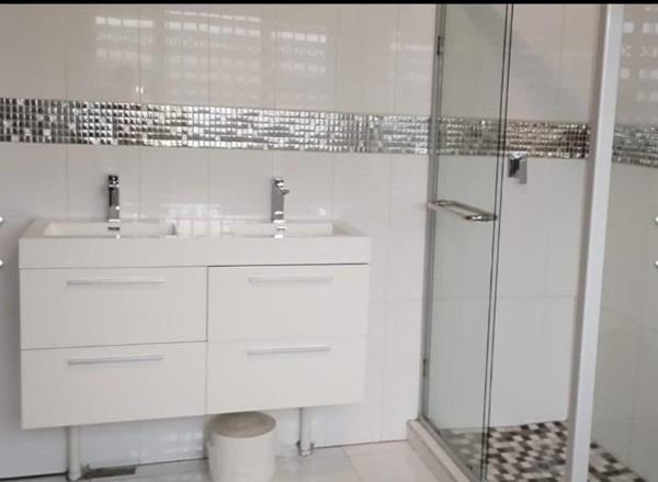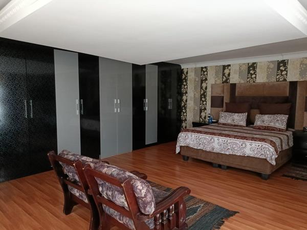 Main bedroom with build in cupboards and an en-suite bathroom Bath, shower and basin