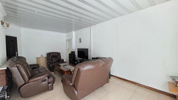 A lounge with tiled floor , overflowing into an extra lounge/TV room.