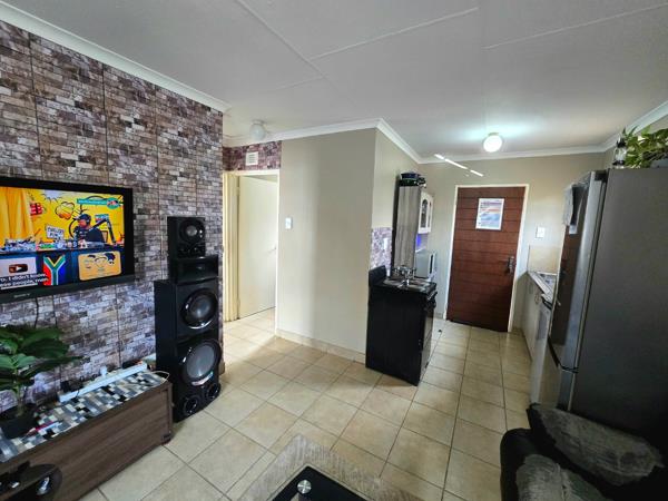 Inside, the home features an efficient open-plan layout, seamlessly connecting the living area with the kitchen. Durable tiled flooring extends throughout these main spaces, ensuring easy maintenance. The lounge area is enhanced by a brick-style accent wall, adding character, and receives natural light through a window fitted with security bars. The functional kitchen is equipped with essential appliances, including a freestanding stove, refrigerator, and washing machine, catering to daily needs within its compact design.