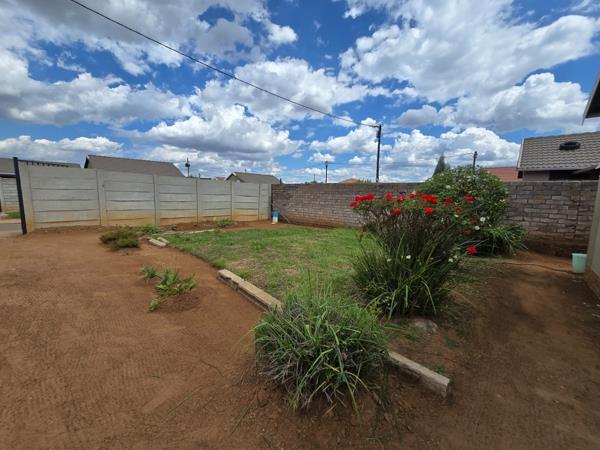 The lounge area is a functional space, benefiting from natural light. The kitchen is equipped with a double sink, countertop, and base cabinets, providing essential amenities and direct outdoor access. The two bedrooms are practical, each featuring tiled floors and natural light, while the single bathroom serves the home''s needs. Security is enhanced with burglar bars on windows and a security gate on the side of the house.