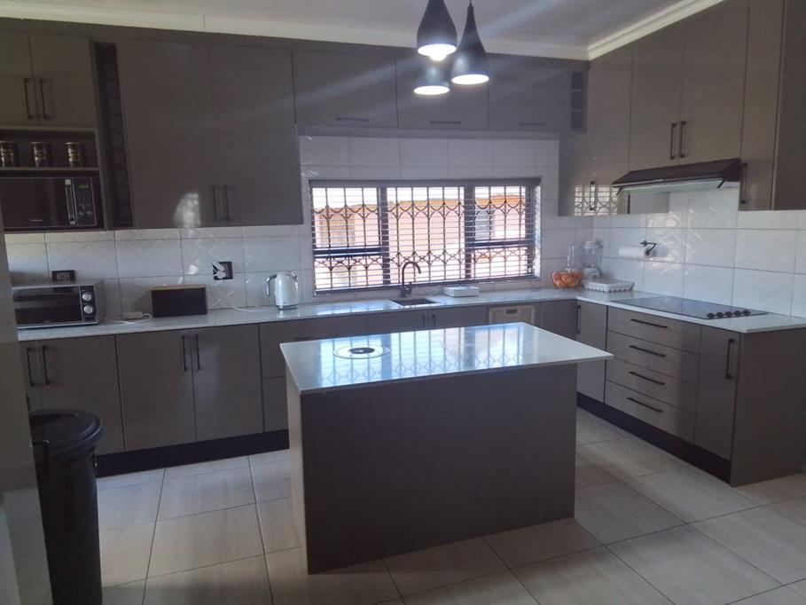 Engineered stone countertops, plenty of cupboard space, island table, double oven, glass top hob, extractor, double sink prep bowl designed for functionality and style.