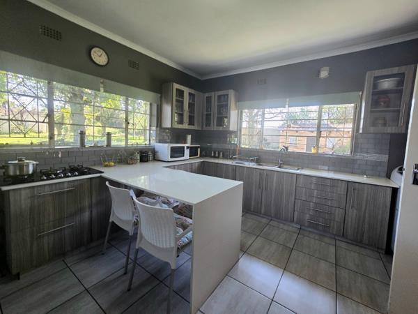 The spacious lounge provides the ideal setting for relaxed family living or entertaining guests, while the separate dining room is perfect for hosting meals and special moments. The modern kitchen is a true highlight, featuring a sunny breakfast nook, sleek tiling, generous cupboard space, a gas hob, and an electric stovedesigned for both style and functionality.