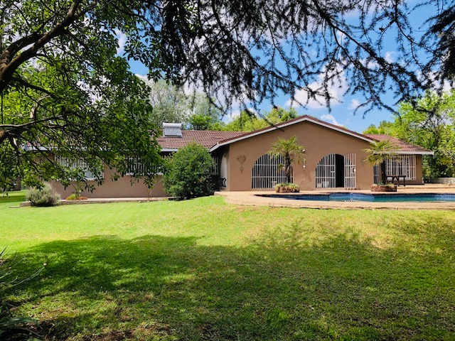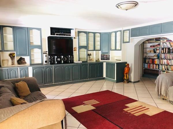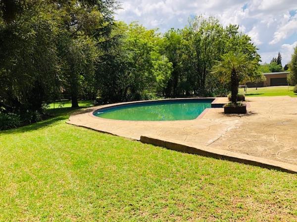 The main house offers a spacious layout with three bedrooms and two bathrooms, including an ensuite in the main bedroom and a guest toilet. A large walk-in storage room connects to a well-equipped kitchen with ample cupboards, leading to a spacious laundry area. The study room is perfect for working from home, while the lounge opens onto a vast stoep leading to a beautiful poolideal for entertaining.