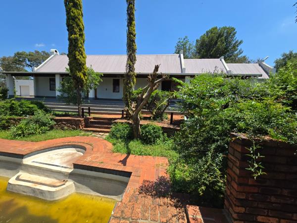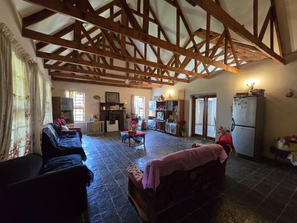 Nestled in the tranquil Homestead Apple Orchards, Walkerville, this expansive property offers a unique opportunity for country living on a generous 26800 sqm erf. The traditional-style residence, spanning 300 sqm, features a multi-gabled exterior and a welcoming covered patio, hinting at its inherent charm. Inside, the home boasts a spacious open-plan layout with high vaulted ceilings and exposed wooden beams, creating an airy and character-filled ambiance. Natural light floods the living areas, which include a lounge and dining room, complemented by durable tiled flooring and a cozy fireplace.