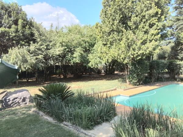 Sparkling swimming pool framed by established gardens and abundant birdlife