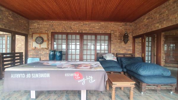Open plan Lounge with a fireplace, fitted bar area leading to an indoor braai and entertainment area with stacker doors opening up unto a sparkling heated pool, overlooking the amazing view of the dam.