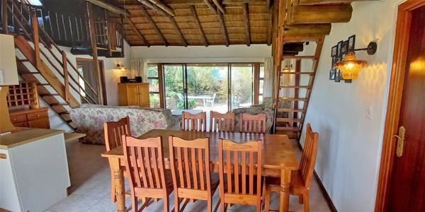 Beautiful cozy double story thatched rustic feel home with its exposed wooden beams and wooden staircases. Featuring 4 bedrooms, 2 bathrooms, (mein-en suite) and a guest toilet. Open plan living area extending onto a patio with a built in braai. Included in the sale is a boat locker, jetty and an extra stand. Furniture and appliances are optional extra.