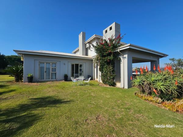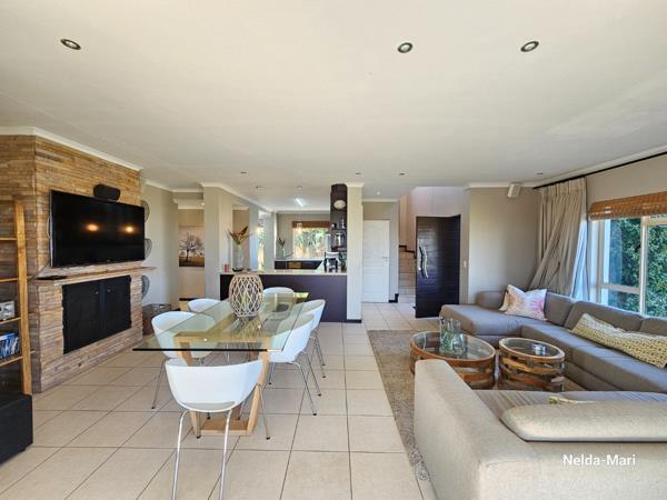 Open plan living area, with built-in Fire place, leading onto a covered patio, with built-in braai, where you can relax and enjoy a beautiful sunset