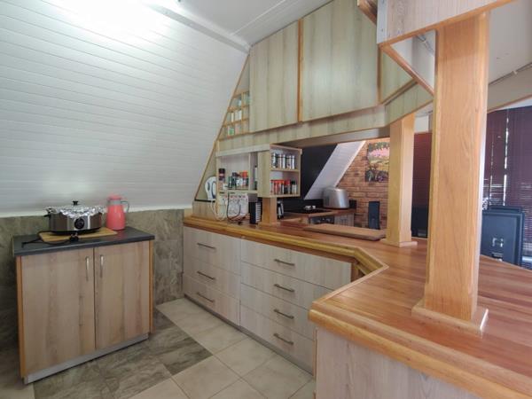 Open plan kitchen with newly fitted kitchen cupboards and stove. The main bedroom leads off the living area. The living area further extends through sliding doors onto a patio with lots of space with beautiful shady trees with a built in braai, birds in abundance on your doorstep. The 2 bedrooms upstairs each lead off onto a balcony. The 1st bathroom has a shower, hand wash basin and toilet, while the 2nd bathroom has a bath, hand wash basin and toilet. extra storage outside. Partially furnished.