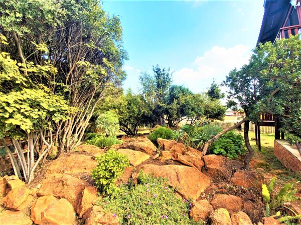 A lovely cosy log cabin house with 2 bedrooms, both have en-suite bathrooms. Single Garage with a store room or workshop that has the potential to be turned into a third bedroom or a flatlet. Beautiful natural indigenous garden with lovely rock features. The enclosed patio leads out onto a deck with the most amazing view over the town of Vaal Marina and the backdrop of the koppies.