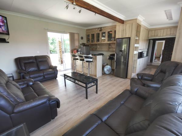 A lovely spacious open plan airy house, ideal for the entertainer with a lovely thatched lapa, with built in braai set in the garden a short stroll from the main house. The kitchen has more than sufficient packing space with a small storage area, open plan to the living area with a very nice gas stove and oven.