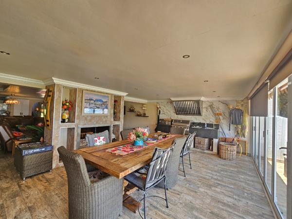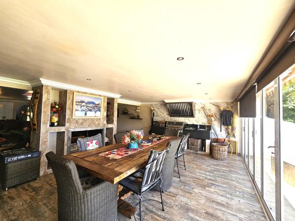Spacious open-plan kitchen and living area leading to an enclosed patio with built-in braai