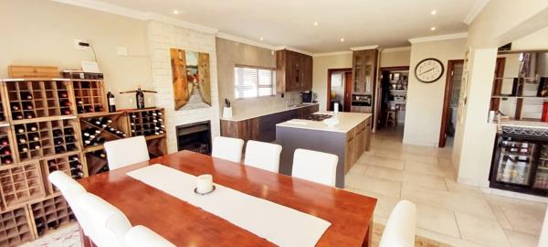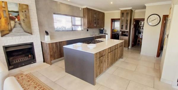 The modern kitchen features a large center island with gas oven, ample cupboard space, and a separate scullery and laundry. Lounge and dining room have their own cozy fireplaces, perfect for year-round comfort.