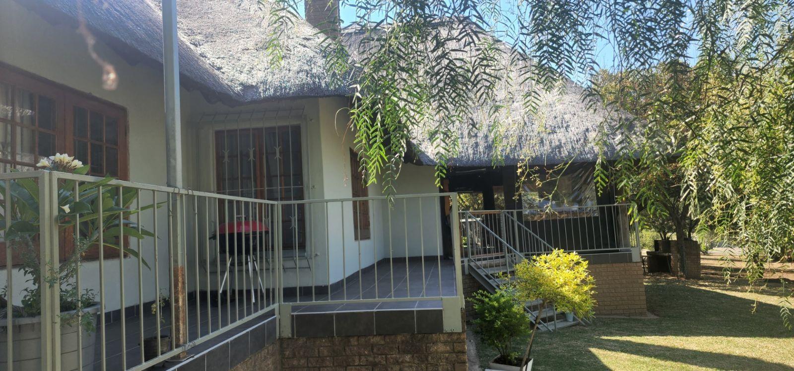 The open-plan living area features a cozy wood-burning fireplace, perfect for relaxing evenings with loved ones. The well-equipped kitchen includes ample cupboard space, fittings for two appliances, and a walk-in pantry big enough for a double fridge all nestled beneath a charming double-volume thatch roof that adds warmth and character throughout.