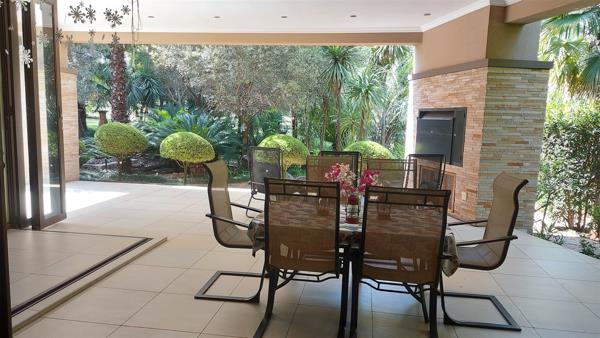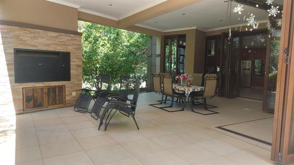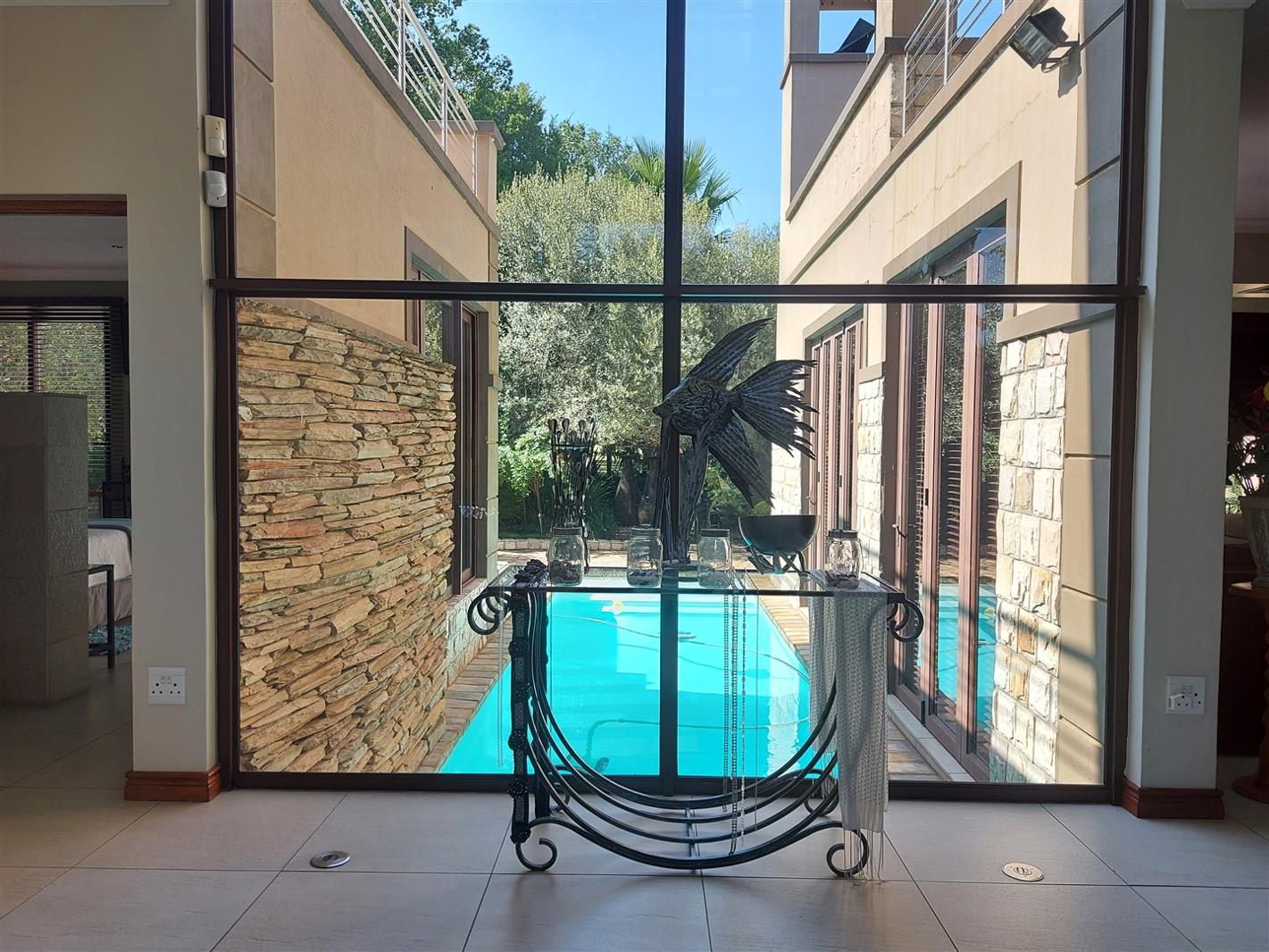 When you first walk into the property, you are greeted by exceptional features such as a double-volume entrance hall with a view of the integral, sparkling swimming pool. High-quality finishes throughout will immediately attract your attention. The open-plan lounge, bar, dining room, and spacious modern kitchen lead out through stacker doors onto a large patio facing North, complete with a built-in-braai and an exquisitely landscaped garden.