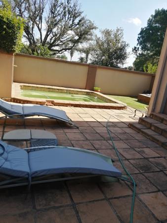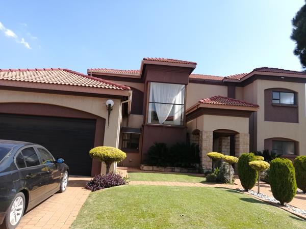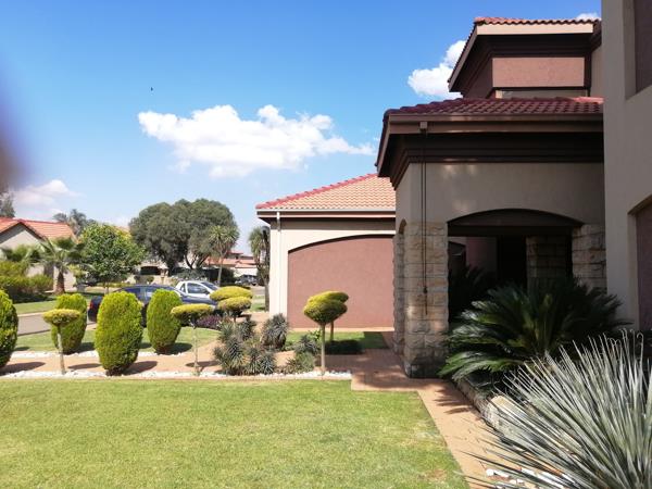 Duplex with tuscan roof type. Situated in a Golf estate with ample opportunities, controlled access with 24 hour security. The Estate offers the restaurant that is separated from the residents. Well taken care off estate with river front. The property offers 4 bedrooms, 3 bathrooms of which 2 is an en-suite, the 3rd one is a bathroom that caters the other bedrooms. Guest toilet situated on the ground floor. Entering from the front entrance you are welcomed by the big entrance hall that leads to the 3 living rooms, dining room and flowing to the kitchen. The kitchen is fitted with modern cupboards with ample space for preparing meals for family and guests. The house is well painted inside out, aluminium windows and doors, designer paving, and a well manicured garden for summer days. The bathrooms are modern as well as the kitchen that offers the cherry wood cupboards. It offers white interior doors, well tiled from top to bottom. The ceilings are designed and are completely well done. The three bedrooms offers the sliding door towards the balcony. The pool is positioned at the back that offers privacy for the family. Driveway paved and leads you to the double garage with automated doors.