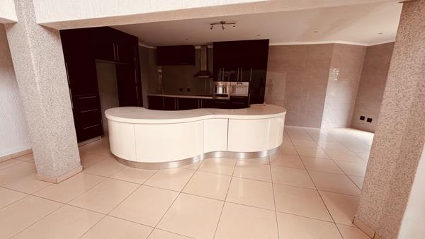 Step inside the expansive 350 sqm floor plan, designed for contemporary living. An impressive entrance hall features a grand spiral staircase with ornate wrought iron railings, bathed in natural light from large, curved windows. High ceilings and modern tiled flooring flow through the open-plan lounge, dining room, and family/TV room. The sleek, modern kitchen is a focal point, equipped with dark cabinetry, integrated double ovens, and a distinctive curved island. Four generously sized bedrooms include two luxurious en-suites, complemented by 3.5 bathrooms in total, featuring a guest toilet and a spa bath. Air conditioning ensures year-round comfort.
