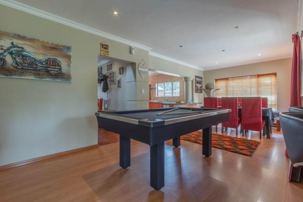 Step inside to an inviting open-plan living, dining, and kitchen area designed for comfort and flow. The kitchen is equipped with ample cupboard space and sleek granite countertops, while a built-in bar makes entertaining a breeze. Large timber doors open onto a charming veranda that overlooks the pool and braai area, making this the perfect setting for weekend gatherings or relaxing afternoons.