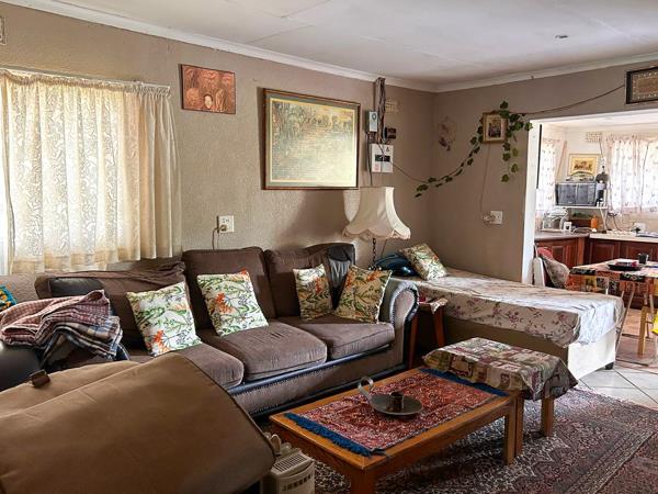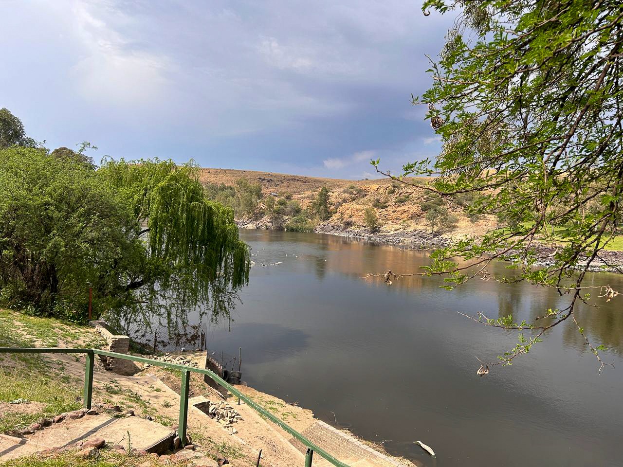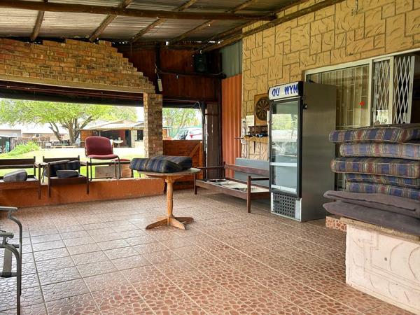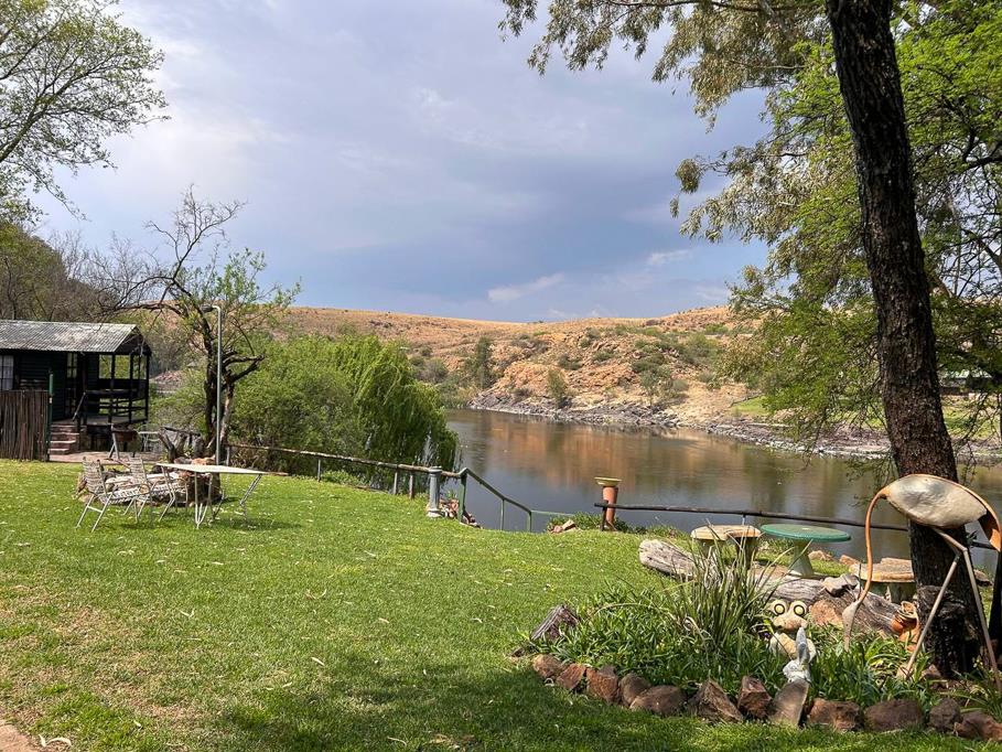 The main home features two cozy bedrooms, a kitchen, living area, dining room, and bathroom. Step out onto the patio to enjoy views of the pool, charming log cabins, and the Vaal River.