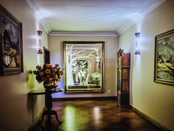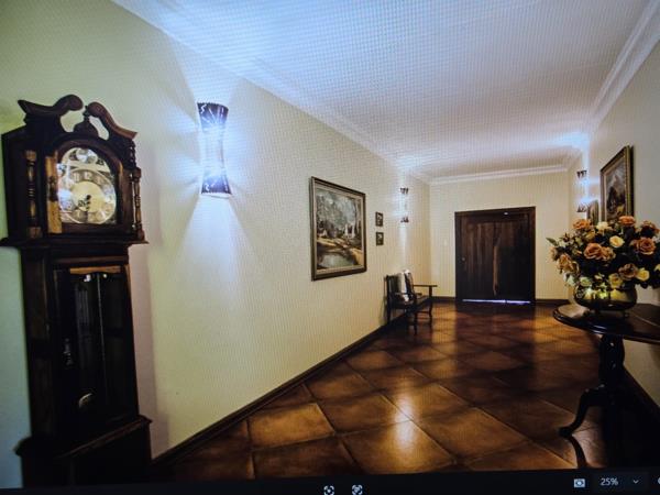 - Spacious kitchen with pantry, separate scullery, custom-made red meranti wood cupboards, and built-in wood & stained-glass wine cellar