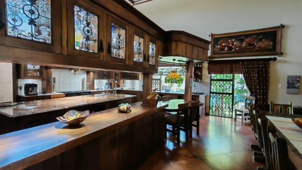 You have a gorgeous entrance hallway leading to a large open-plan living area with a built-in braai with rotisserie, stacker doors, a spacious kitchen with custom-made meranti cupboards, high-end appliances, seperate wash-up, laundry, walk in pantry and built in wood and stained glass wine cellar.
