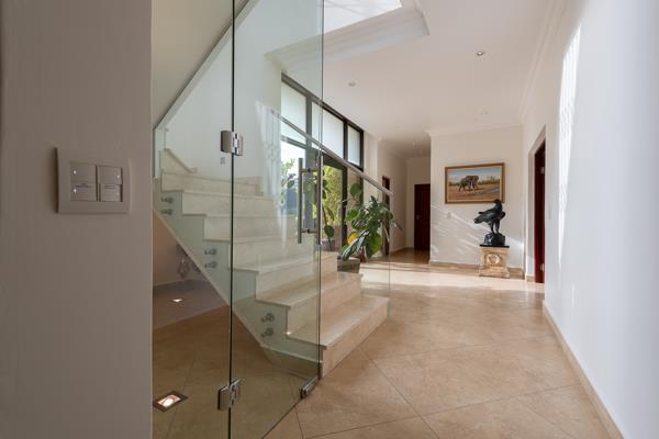 Experience the ultimate in comfortable living as you arrive at the face-brick main house, designed with meticulous attention to detail. Enter into three expansive tiled living areas that seamlessly merge with an exotic, dark wood kitchen. The kitchen is a culinary haven, complete with high-end Miele appliances, a built-in 5-plate gas stove, electric oven hob, and a central island crowned with exquisite Caesar stone tops. Delight in the convenience of two built-in food warmers, full induction stoves, an extractor, and a wine cooler fridge.