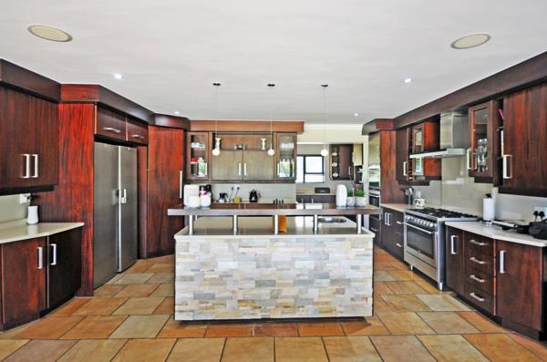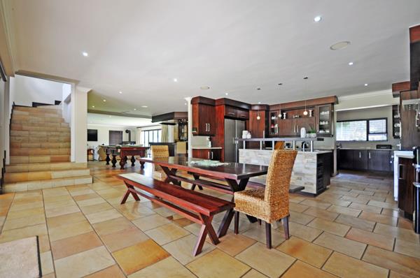 A covered recreation area with a kitchenette and braai sits alongside the swimming pool and a beautiful koi pond.