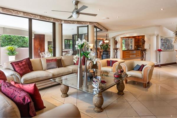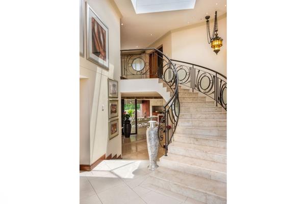 A grand double-volume entrance welcomes you into an expansive open-plan living area, which includes a sophisticated lounge with a gas fireplace, a stylish dining room, and a designer kitchen equipped with a separate scullery and pantry.