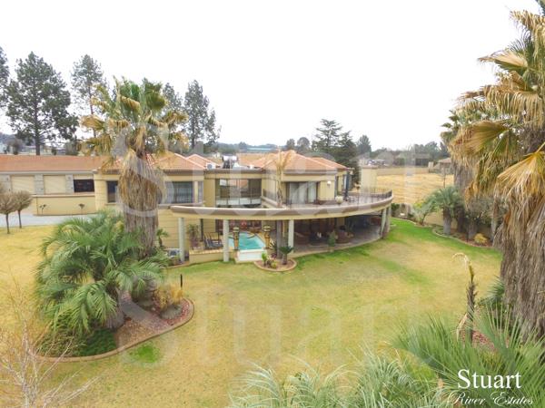 Manicured gardens with lush, evergreen lawns and towering palms, irrigated with river-fed water, create a tranquil paradise.