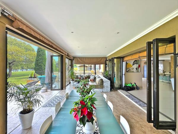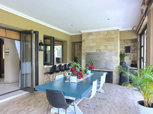 Elegance abounds in this stunning custom designed 3-level home. The expansive open plan living area features a gourmet kitchen with both a centre island and peninsula, thoughtful design elements and ample counter space, a cosy lounge, TV room with fire place, built in bar and guest toilet. This space opens onto the large outdoor entertainment area with built in Gas braai, dining area and lounge that effortlessly opens onto the manicured lawns and river, bringing the outdoors in.