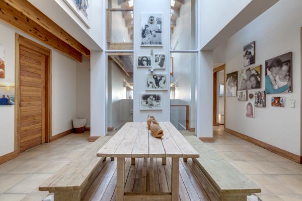 Upon entering, you are greeted by a grand entrance hall featuring a vaulted ceiling, cozy gas fireplace, and a sophisticated drinks serving area. The open-plan living space extends into a generously proportioned dining area with a custom-designed table, a contemporary kitchen with Caesarstone countertops, double ovens, and a five-plate gas hob. Separate scullery. Adjacent to this is a stylish lounge and sunken library area with a second fireplaceideal for relaxed evenings.