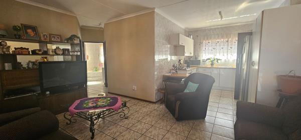 Property offers an open plan living room and melamine kitchen with breakfast nook.