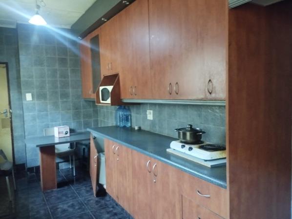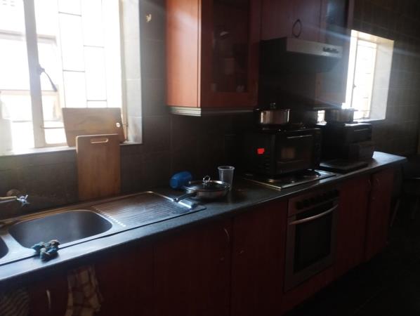 With 8 bedrooms and three bathrooms, you also have the kitchen with dark wood cupboards.