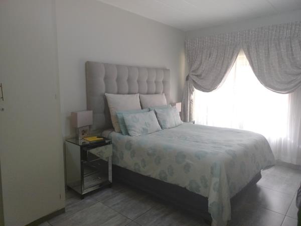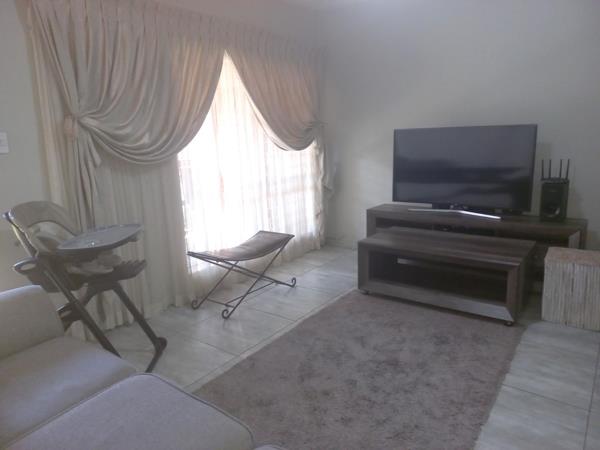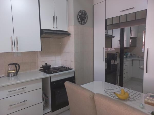 Extremely neat unit, beautiful kitchen with ample cupboards and work surface. Lounge leads out onto enclosed patio, separate dining room can be used as a 3rd bedroom. Unit has 2 garages, communal pool in complex.