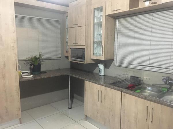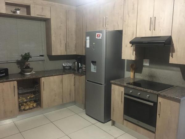 Modern and beautiful. Neat family home with lounge, dining room and a beautiful - fitted kitchen with melamine cupboards, and undercounter oven and hob.