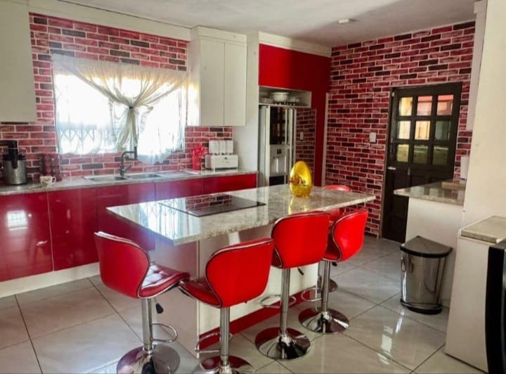 The gourmet kitchen is a focal point, boasting vibrant glossy red cabinetry and distinctive brick-patterned feature walls. It is equipped with a large central island, integrated hob, ample granite-style counter space, and an integrated refrigerator, catering to culinary enthusiasts. The property comprises four generously proportioned bedrooms and three well-appointed bathrooms, including two en-suite facilities and a convenient guest toilet.