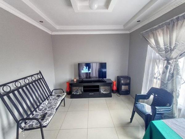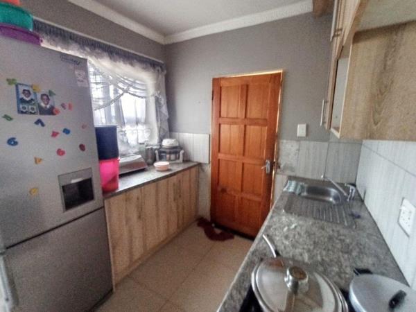 The home includes a kitchen with built-in cupboards (BICs) and an electric stove, as well as an open-plan lounge and dining areaideal for family living. The access door opens onto a patio secured with burglar bars and a gate, and all windows have aluminum frames with burglar bars for added security.
