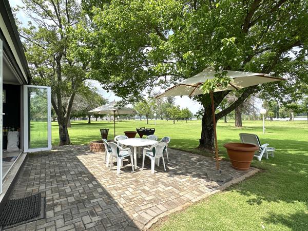 The home features three bedrooms with built-in cupboards and a modern bathroom. Open-plan living flows from the kitchen with peninsula, dining area and lounge / TV room with fire place, creating a versatile space for both entertaining and relaxed family living. Stacker doors open seamlessly onto a private patio, perfectly positioned under a mature tree, offering 180-degree garden and river views.