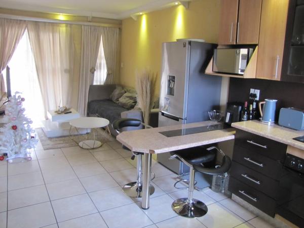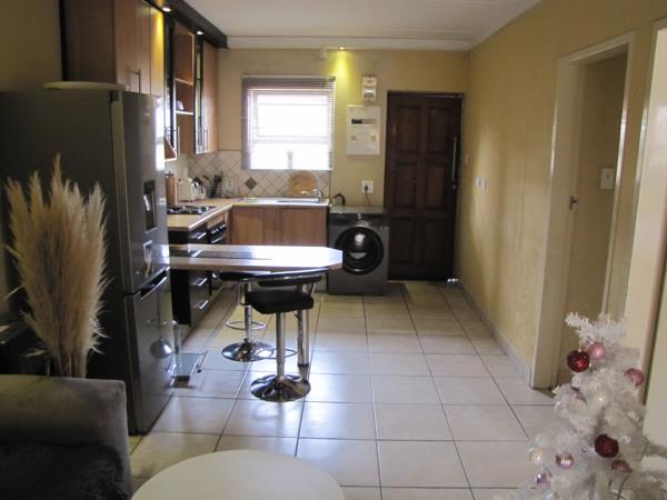 The tiled apartment has an open plan kitchen with ample built-in cupboards and breakfast nook. Further on is the open plan lounge that has a sliding door leading to the outside patio that has a built-in braai.