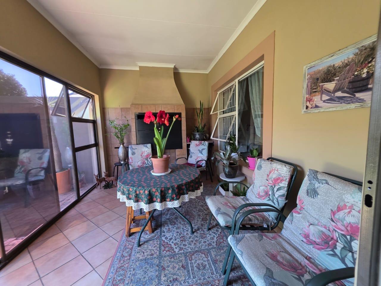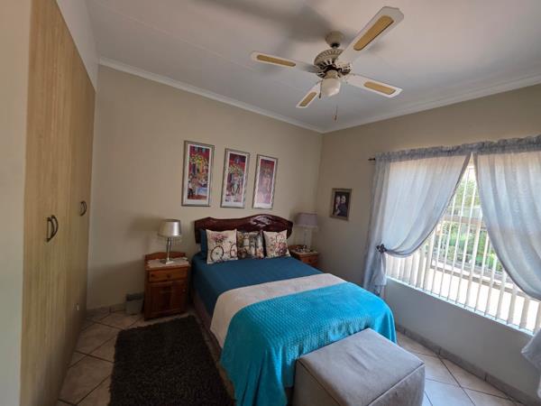 Outdoor living is a highlight with a delightful enclosed patio, perfect for all-weather enjoyment. This versatile space includes a built-in braai, making it ideal for entertaining guests or relaxing with family. The property also features a beautifully maintained garden and lush lawn, enhancing its kerb appeal. Parking is well-catered for with two garages, and pets are allowed, adding to the home''s appeal.