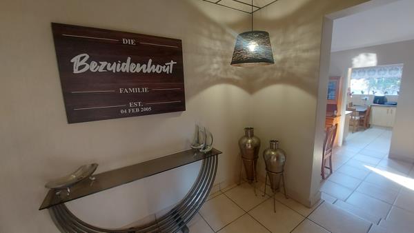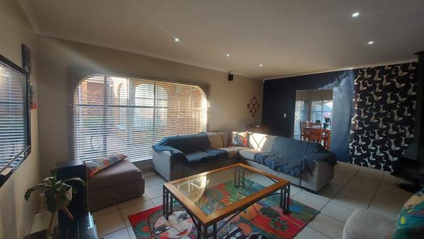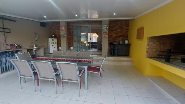 - Living room with a fireplace and sliding doors opening to a gorgeous entertainment area with a built-in braai and wash area for convenience.