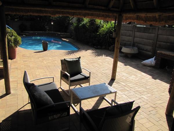 Adjacent to the kitchen is the entertainment lounge with a built-in bar. A sliding door gives access to the the Lapa and sparkling swimming pool. The remainder of the living areas consists of an open plan lounge and dining area which has a roof skylight.