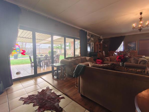 The covered patio looks out on a beautiful garden with sprinklers and a heated pool which is perfect for the kids and pets as there is also a play house.