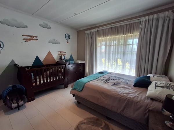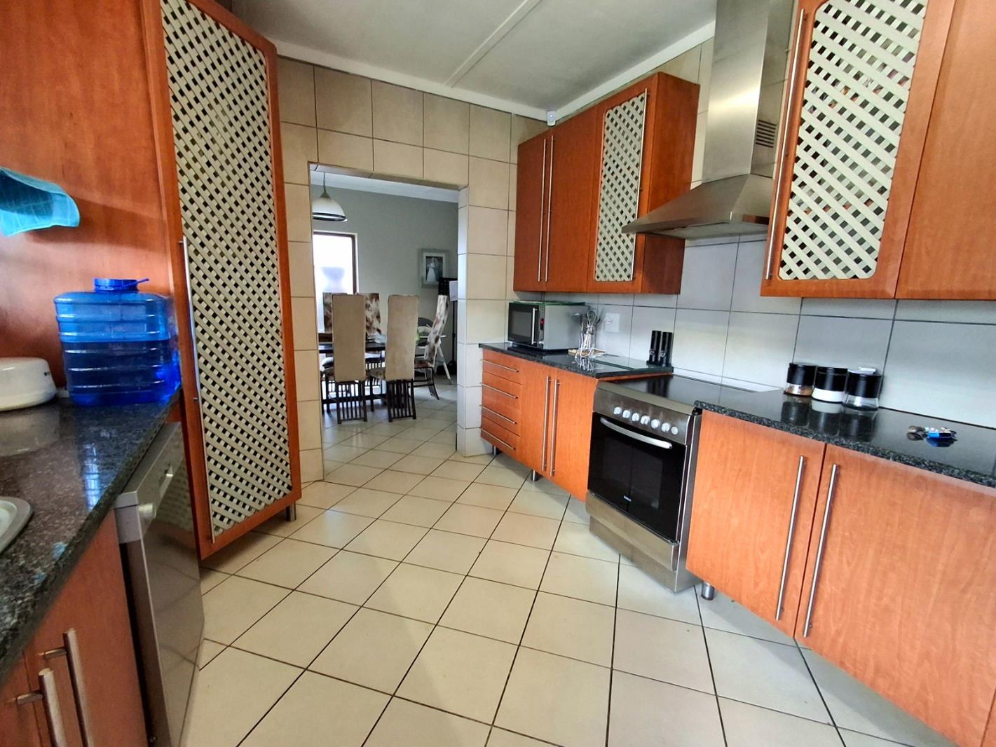 The property extends its living spaces outdoors with a refreshing swimming pool and a patio, ideal for relaxation and alfresco dining on the generous 817 sqm erf. Secure parking is provided by a double garage, complementing the suburban lifestyle.