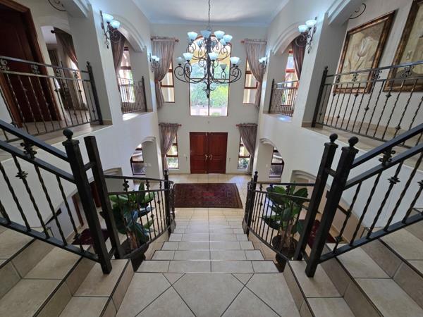 The home has a spacious reception area with an impressive staircase that leaves you in awe. Moving through the lower level of the house, a jewel box is opened which consists of a study with built-in cupboards, a large billiard room with wooden cabinets, a guest toilet, open plan lounge / dining area with a built-in bar, an open plan kitchen that has a table top stove with an extract fan and an eye-level oven. Adjacent to the kitchen is a large room that has a scullery, laundry and pantry. An eight seater cinema for entertainment with family and friends and a spacious patio that has a built-in braai. From here there is access to the back garden that has a sparkling swimming pool.