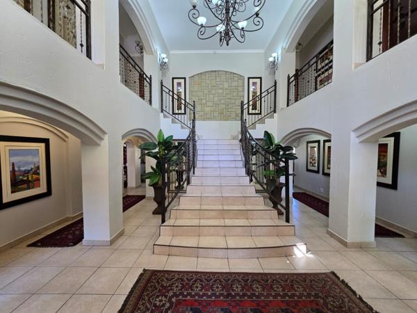 The home has a spacious reception area with an impressive staircase that leaves you in awe. Moving through the lower level of the house, a jewel box is opened which consists of a study with built-in cupboards, a large billiard room with wooden cabinets, a guest toilet, open plan lounge / dining area with a built-in bar, an open plan kitchen that has a table top stove with an extract fan and an eye-level oven. Adjacent to the kitchen is a large room that has a scullery, laundry and pantry. An eight seater cinema for entertainment with family and friends and a spacious patio that has a built-in braai. From here there is access to the back garden that has a sparkling swimming pool.