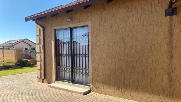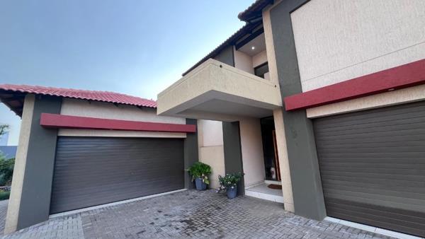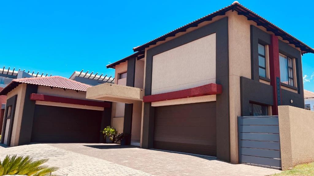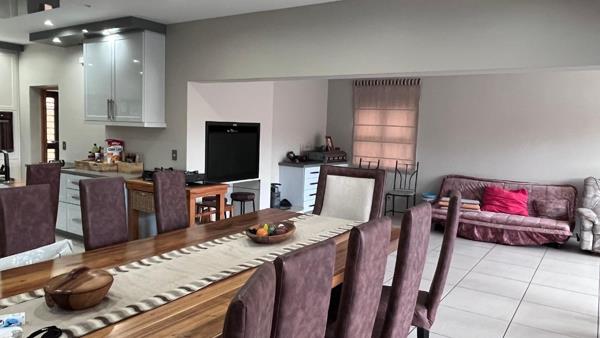 four automated garages with space for a trailer or golf cart, a bedroom with an ensuite bathroom, a guest toilet, and open-plan living areas for easy entertainment. The area includes a TV room, dining room, kitchen with separate laundry and scullery, and an entertainment area with a built-in braai, Staggered doors open to the patio with an additional built-in braai and adjacent covered patio overlooking the pool. There''s also an outside toilet and storage room.